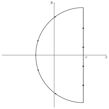 , we exploit the fact that we can evaluate integrals in the complex plane by using the residue theorem. We imagine a contour consisting of a vertical straight line and a semicircle enclosing an area to the left of