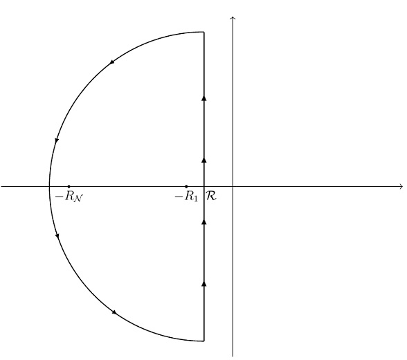 It then follows by Cauchy’s residue theorem, and the fact that the integral along the circular arc component of the contour vanishes as the radius of the semicircle goes to infinity, that
