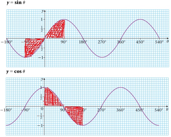 Furthermore, we can again restrict the range of integration in (12) and switch between sine and cosine as indicated in the following graphs: