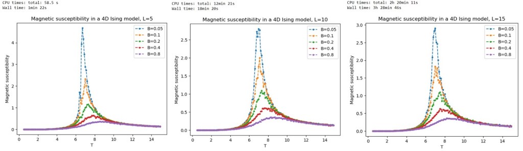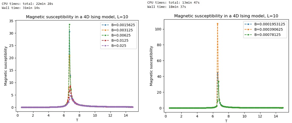 For the purposes of a lecture on simulating the Ising model of ferromagnetism using the Metropolis-Hastings algorithm, I explored the behaviour of magnetic susceptibility on a four-dimensional hypercube lattice. In particular, I wanted to test a well-known prediction of theoretical physics that a zero-field singularity should appear at a certain critical temperature. The idea is that there is an essential singularity in the mathematics at zero external magnetic field which disappears with a non-zero magnetic field. See the discussion on physics Stack Exchange about this. I was interested to see if a computer simulation of magnetic susceptibility in an Ising model on a four-dimensional hypercube lattice would produce similar results as the second diagram in this Stack Exchange query, which I reproduce here: