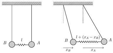 Before considering the case of quantum oscillators in a lattice, it is instructive to explore a specific example of the situation for ODEs describing a simple mass-spring system. Consider two identical pendulums, and , connected by a spring whose relaxed length is exactly equal to the distance between the pendulum bobs.